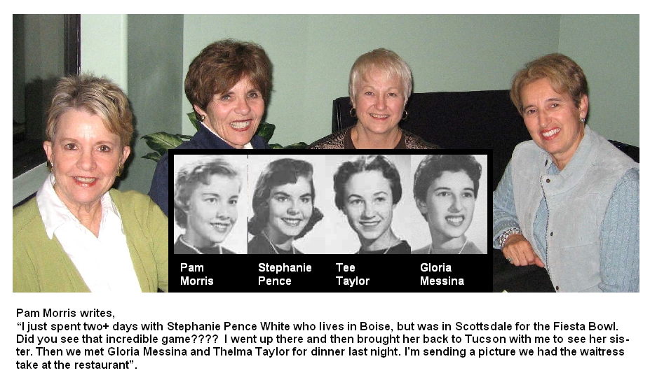 Margie submits this picture of the May, 2009 "Lot'sa Laughs" Ladies Luncheon at the Barrio Grill, downtown Tucson. Great friends--great food. left to right...Judy Randall, Jeanne Webb, Judie Mowry, Charlene Ziss, Thelma Tayor and LeeAnn Ferguson. A great time was had by all. Editor: Hey, where's Margie Tench? She must have taken the photo.